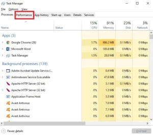 مرحله 3: روی برگه «کارایی» (Performance) کلیک کنید.