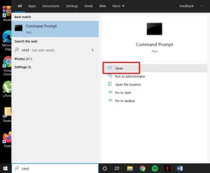 مرحله 1: روی «منوی شروع» (Start Menu) کلیک کرده و کلمه cmd را تایپ کنید. سپس با کلیک روی گزینه «باز کردن» (Open) آن را اجرا کنید.
